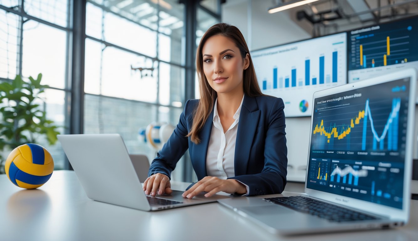 Seorang wanita profesional sedang menganalisis strategi permainan voli di kantor modern dengan alat digital dan bola voli di latar belakang.