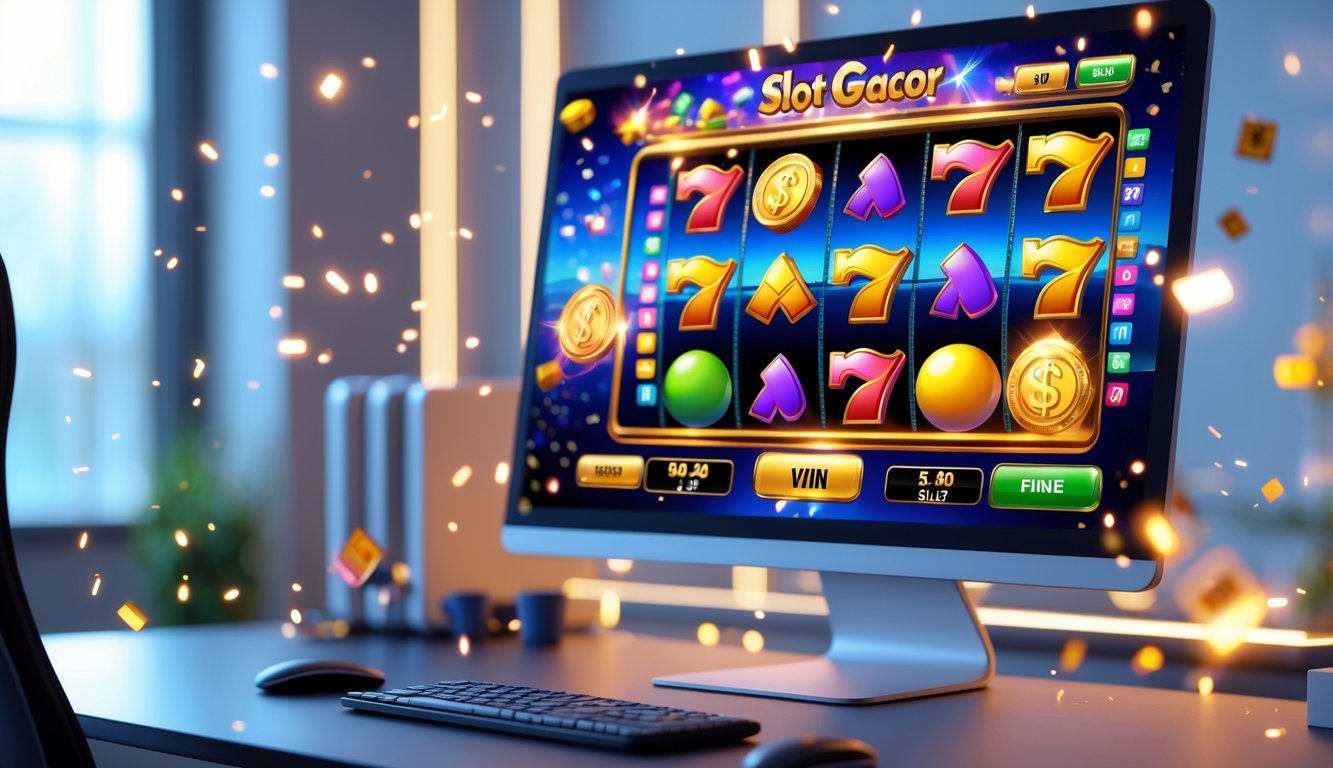 Layar perangkat menampilkan permainan slot online dengan simbol warna-warni dan efek cahaya, di atas meja bersih di ruangan yang terang.